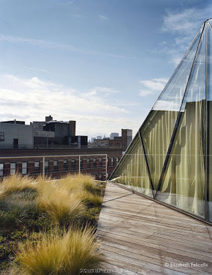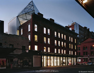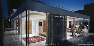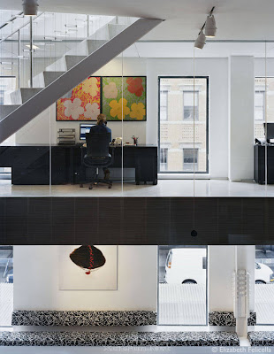 A series of three double-height spaces follow the stairdelier as it makes its way through the building, providing spatial variety to the relatively generic office floors and providing flexibility, allowing the building to transform for special events, parties, and performances. The first of these is the lobby, where the stair widens to create a dramatic presence and Ms. Von Furstenberg’s art collection is displayed around a long reflecting pool. On the showroom floor, a second double-height space can accommodate 100 people as a small black-box theater. In addition, the showroom’s display racks are designed to roll away to create space for events.