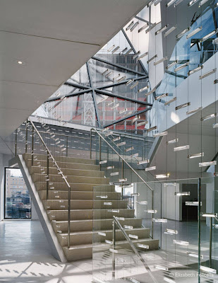 In order to maximize natural light, a series of heliostat mirrors were installed within the diamond. The primary mirror, facing south, tracks the sun throughout the day, reflecting it to a fixed secondary mirror that beams the sunlight down the stair, always at the same angle. Tertiary mirrors along the stair’s length further direct the light onto the stair’s guardrail - vertical steel cables that are structurally braced with Swarovski glass crystals. The crystals also help disperse the light to each floor