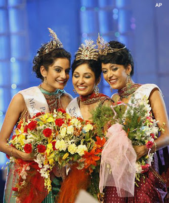Newly selected Miss India World Pooja Chopra (R), Miss India Earth Shriya Kishore (C) and Miss India Universe Ekta Chaudhary (L) wave as they win their respective pageants during Pantaloons Femina Miss India Pageant 2009 in Mumbai on April 5, 2009.