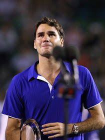 Roger Federer of Switzerland sheds tears during the awarding ceremony after the men's singles final against Rafael Nadal of Spain at Australian Open tennis tournament in Melbourne, Feb. 1, 2009. Nadal won the match 3-2